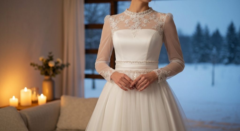 לחתונה חורפית חשוב לבחור שמלה עם שרוולים ארוכים או אפשרות להוסיף ז'קט או כיסוי. בדים כמו סאטן וקטיפה מתאימים יותר לחורף מאשר שיפון דק. שמלות צנועות עם כיסוי מלא הן בחירה מצוינת שמשלבת חמימות עם אלגנטיות.