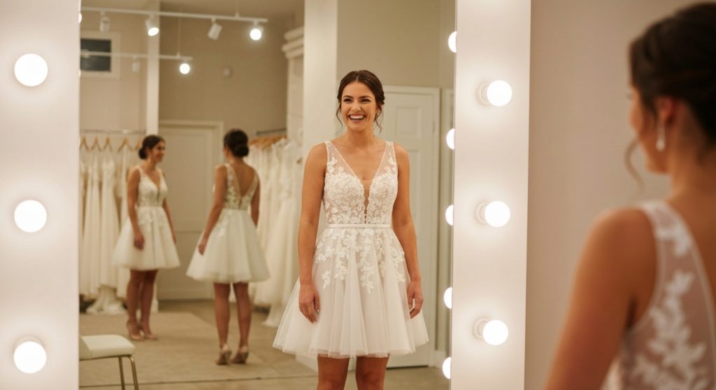 אז הצעתי לה לנסות משהו אחר. שמלת כלה קצרה באלגנטית, עם תחרה עדינה וחגורה שמדגישה את המותן. הרגע שהיא לבשה אותה, הפנים שלה השתנו לגמרי. "זה אני" – היא אמרה, והחיוך שלה אמר הכל.